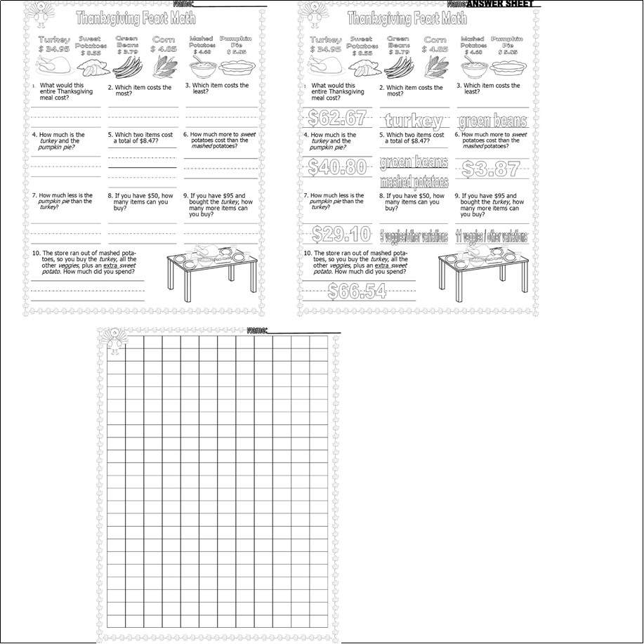 Thanksgiving Math Worksheets and Activities for Kids - ThoughtCo The Thanksgiving math worksheets at Kidzone are conveniently organized by grade level. You'll find worksheets from children in Grades 1-5. The skills included in these worksheets are magic squares, math tables, word problems, adding, number sentences, decimals, multiplication, and division. Holiday Worksheets Commemorate the contributions of brave men and women who serve in the US military using these Veterans Day worksheets, with literacy activities like Veterans Day vocabulary, unscramble sentences, reading comprehension and math activities like plotting ordered pairs, estimating money and more! Thanksgiving Day Worksheets Thanksgiving Worksheets - Super Teacher Worksheets Thanksgiving Worksheets Thanksgiving Worksheets It's almost Thanksgiving! Here are some fun puzzles, activities, crafts, and worksheets you can use with your class. Thanksgiving Games & Activities Thanksgiving Turkey Pattern FREE Cut out the turkey pattern and the feathers. Write on the feathers. Glue them on the turkey's body. View PDF Thanksgiving Money Math Teaching Resources | Teachers Pay Teachers Math, Special Education, Thanksgiving Grades: 1st - 12th Types: Centers, Printables, Task Cards Add to cart Thanksgiving Feast Math Worksheet * Adding & Subtracting Money * Word Problems by Teaching Inclusion 5.0 (3) $1.50 PDF Easel Activity